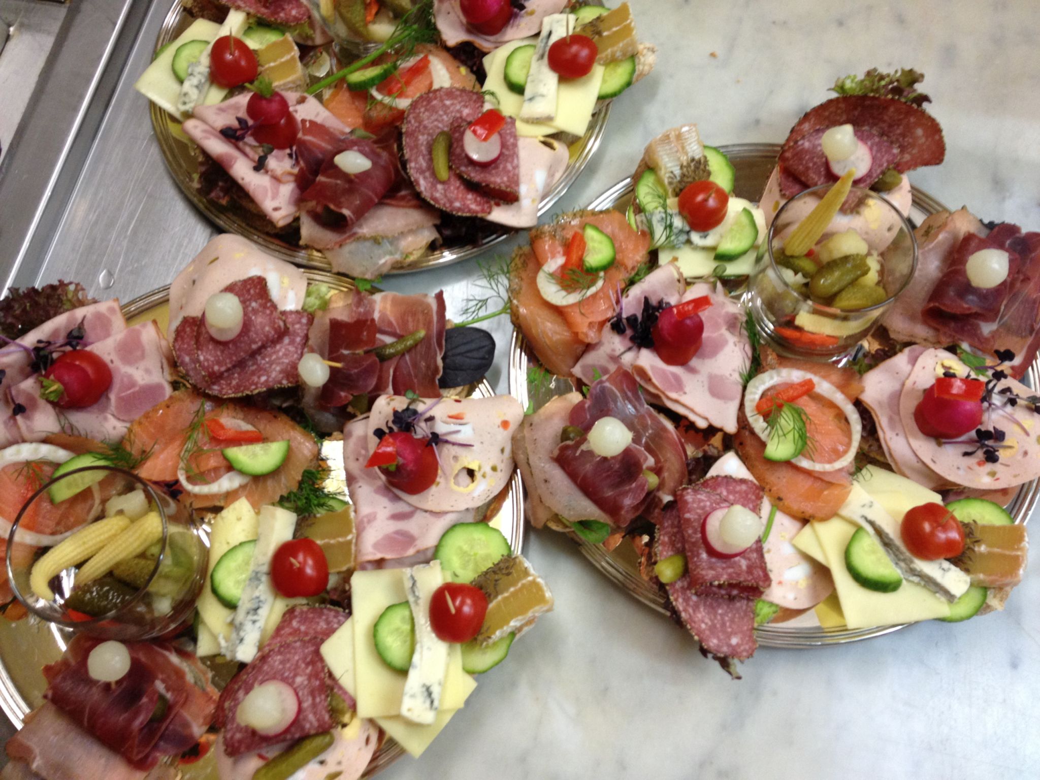 Wurst, Käse und Leckereien auf Platten eingestellt, liebevoll dekoriert und nur pro Gedeck